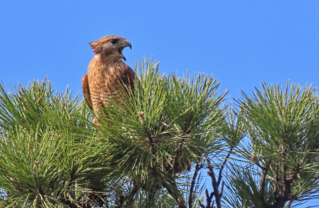 A hawk with reddish-brown plumage is perched on a branch of a pine tree, surrounded by green pine needles and cones. Another bird, likely an owl, is partially visible on a nearby branch. The background shows a clear blue sky.