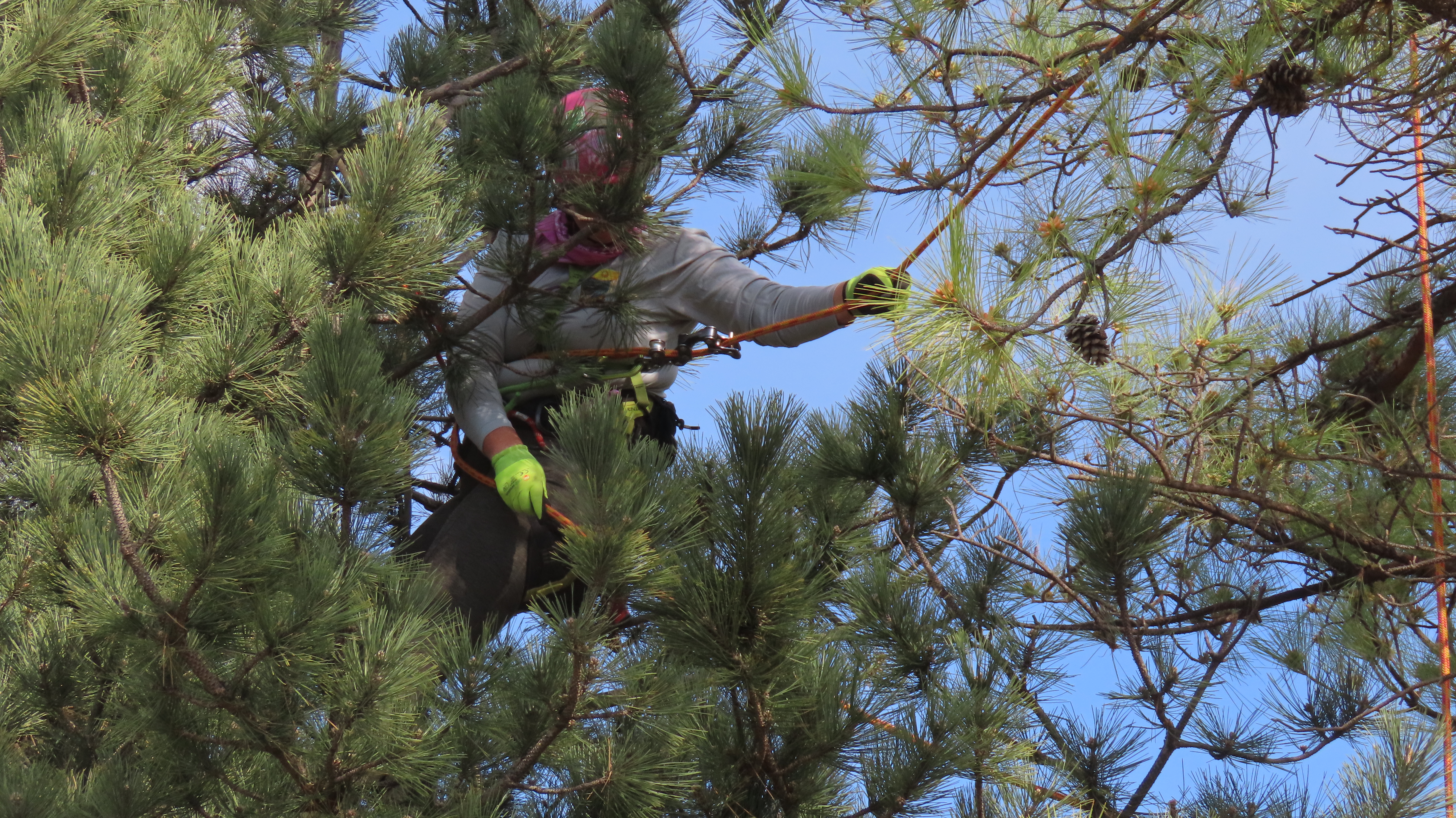 A person wearing safety gear, including a helmet and gloves, is seen climbing and working among the branches of a pine tree. The scene includes lush green foliage and a clear blue sky in the background.