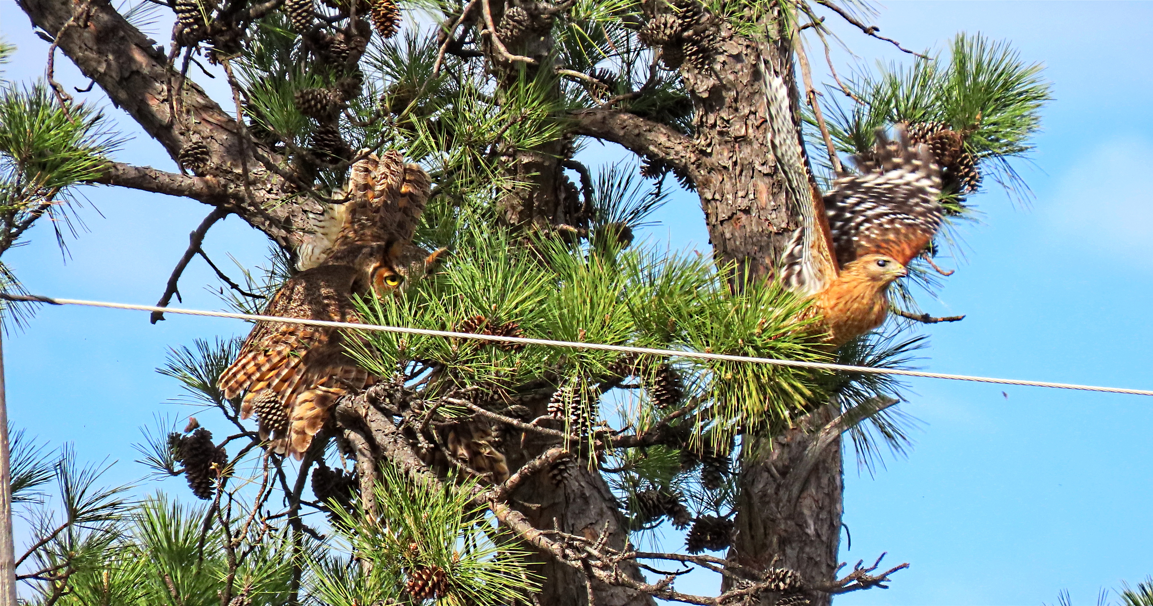 A red-shouldered hawk just after its strike on the great horned owl
