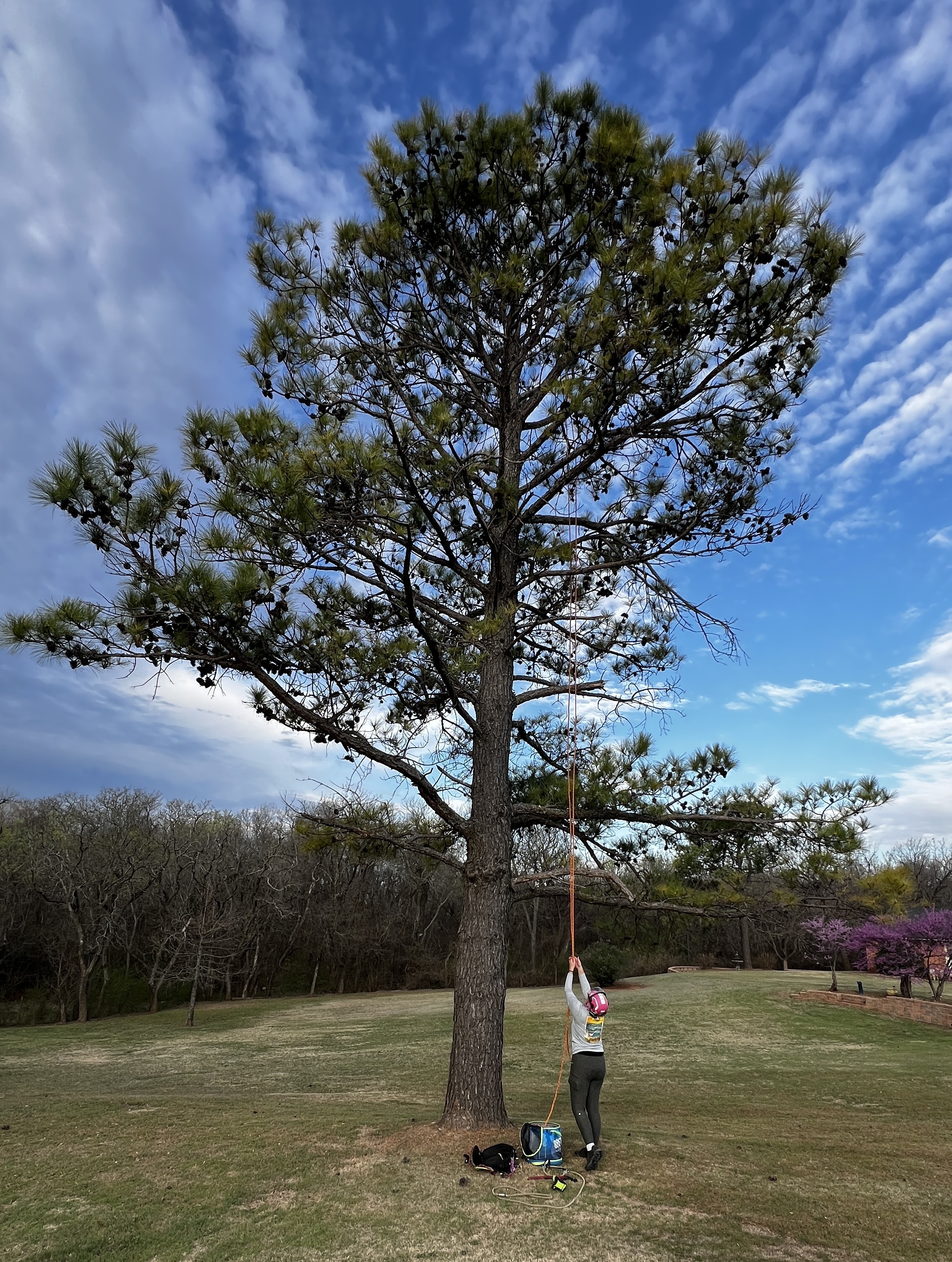 Barbara Fuson, a professional arborist with Lumberjane Tree Services, volunteered her time to climb the tree and return the owlet. Despite the tree’s impressive height, she made the climb look effortless.