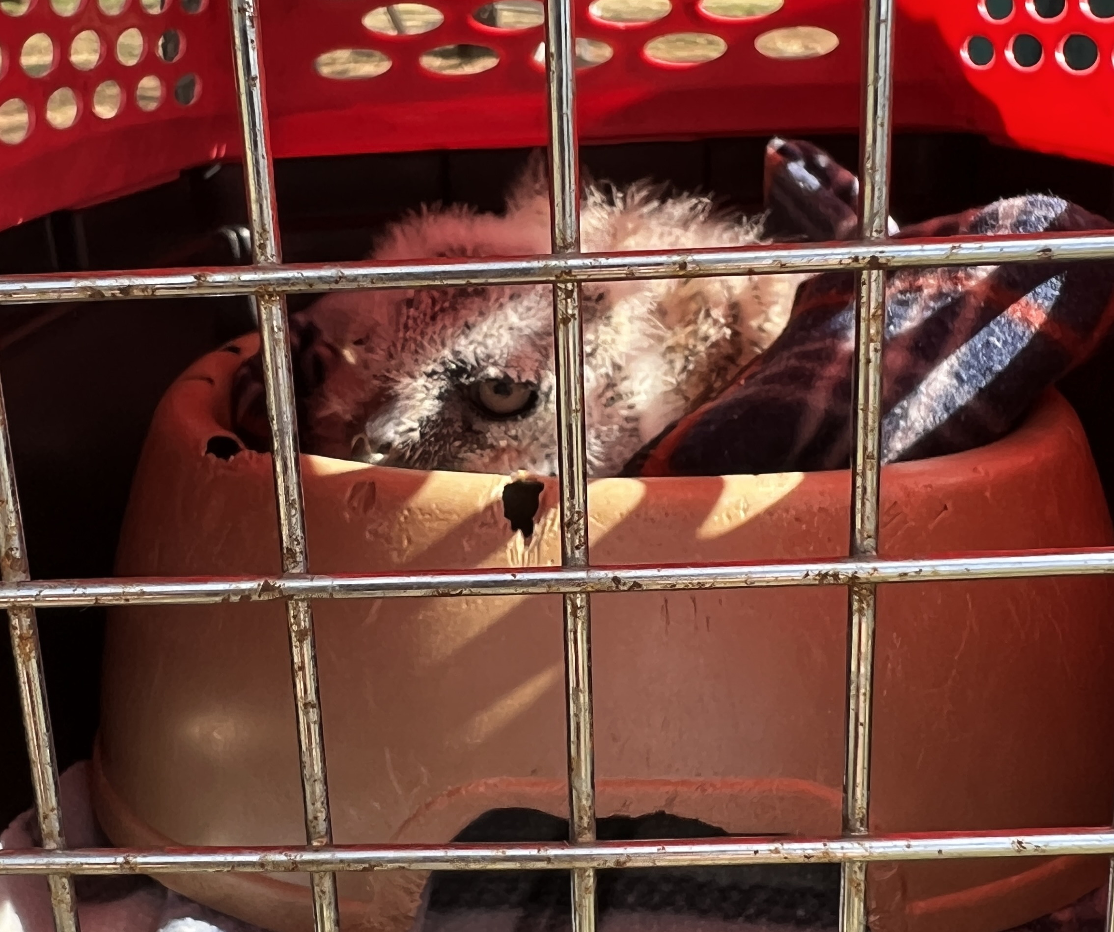 A small, fluffy owl is resting inside a pet carrier, which has a red exterior and metal bars. The owl is peeking out from the carrier, with one eye visible, surrounded by a soft blanket. The interior of the carrier appears warm and comfortable.